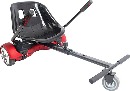 Available in some great colours – including a pretty impressive pink – and able to handle all sizes of hoverboard, this one has proper rubber wheels, twin handles for driving, a wide seat and is suitable for off-road use with twin shock absorbers. We do like the idea of suspension, especially if you are going off-road, as it will give a whole new dimension to the ride. The height maximum and minimum are as standard, and it takes up to 120kh. We like this one as it really looks the part.