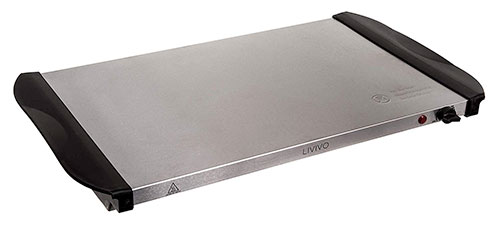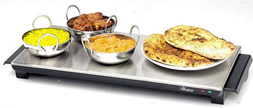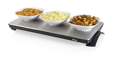 For a powered device, we would recommend you take a closer look at the Swan XL Cordless Hot Plate. With the advantage of a cordless set up – you can heat it for an hour’s use in just a few minutes – this portable and neat model comes from a name brand, is simple to use, is nicely made and will keep your food warm long enough, and it can be heated again in a few minutes if you need more time.