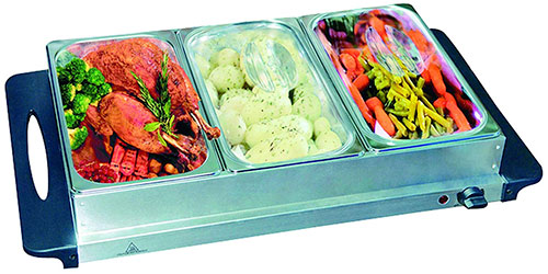 This is the first of the electric models on the list, and it’s a large one designed for various uses. It comes with three warming trays, which are stainless steel to absorb the heat, designed to fit perfectly together onto the electric hot plate. Each of the pans also has a lid, and in place, the hot plate can keep food warm for up to three hours, according to the manufacturer.
