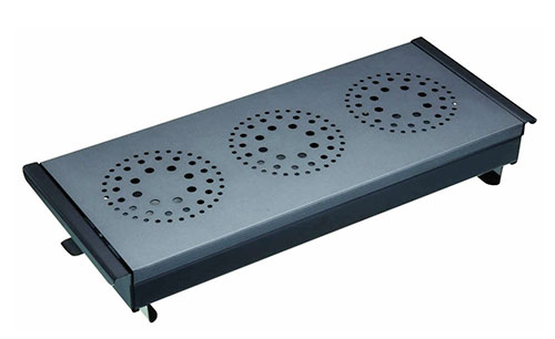 Our first food warming tray is what we would call a typical tea-light model. It’s a no-frills, simple triple plate design that is practical and neat. The heating surface area is designed with several rings of holes in each of the three places, beneath which a tea-light is lit. The effect is to keep the bottom of the plate or dish on top heated, which helps with food warming. It can also be used for heating plates before serving onto them.