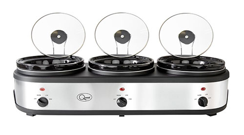 The final food warming tray on our list is another of the slow-cooker type, but this is a much bigger model than the one we looked at earlier. This is from Quest, and comes with 3 x 2.5litre pots – these are also ceramic pots and come with lids plus lid stands – and each can be individually controlled with low, hot and keep-warm settings. It can keep food warm – if that’s what you want to use it for – for up to 4-hours, and is powered by a permanent electric cable.
